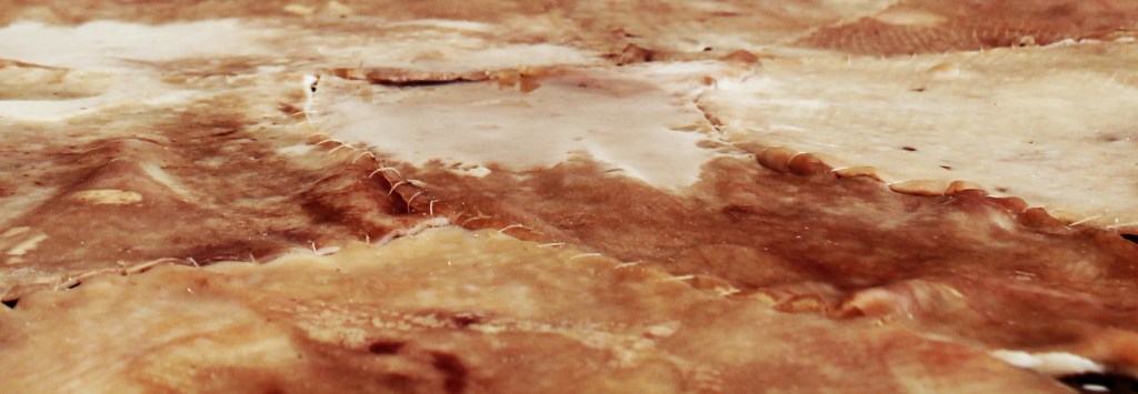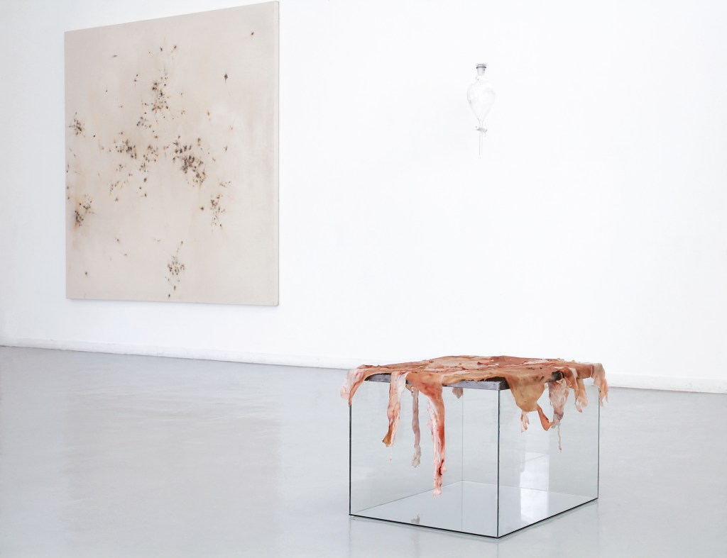 Couenne de porc cousue, métal, verre, ampoule à décanter, acide chlorhydrique,