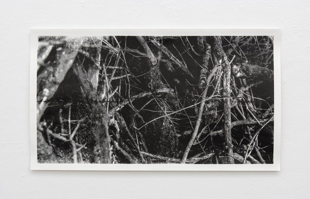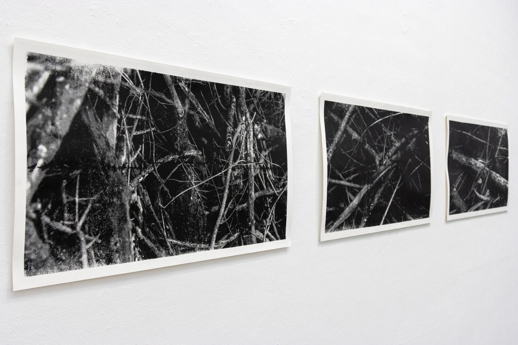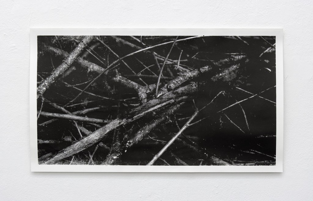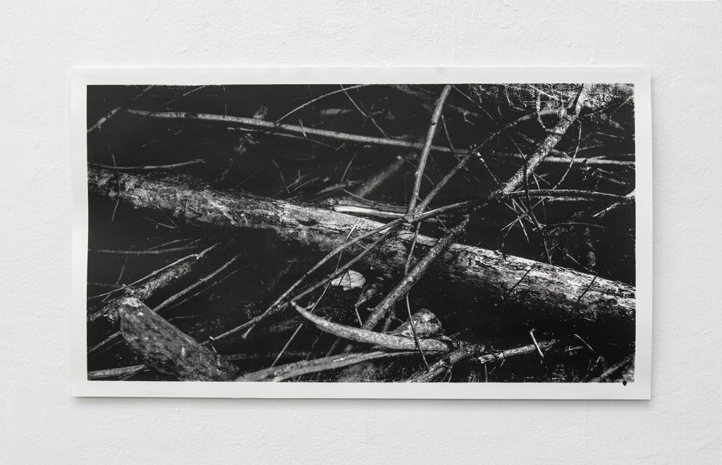 Dans la continuité des bas-reliefs en grès de Traces, cette série reprend des zooms photographiques pris au cœur des entrelacs de branches d’un terrier-hutte de castor abandonné. Ce dernier, d’une amplitude d’environ 8 mètres de diamètre, ne peut que laisser imaginer la présence du castor sur ce territoire. Probablement installé dans ce terrier durant un moment, il ne reste ici que le bois, qui devient alors porteur d’une mémoire et qui conserve dans sa texture et dans ses enchevêtrements toute l’histoire d’un passage : la construction, l’habitation, puis l’abandon.