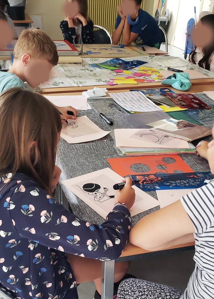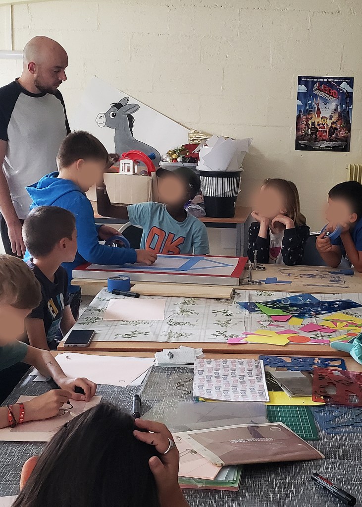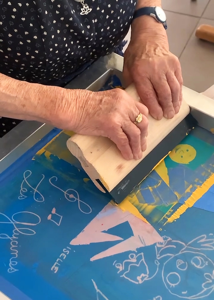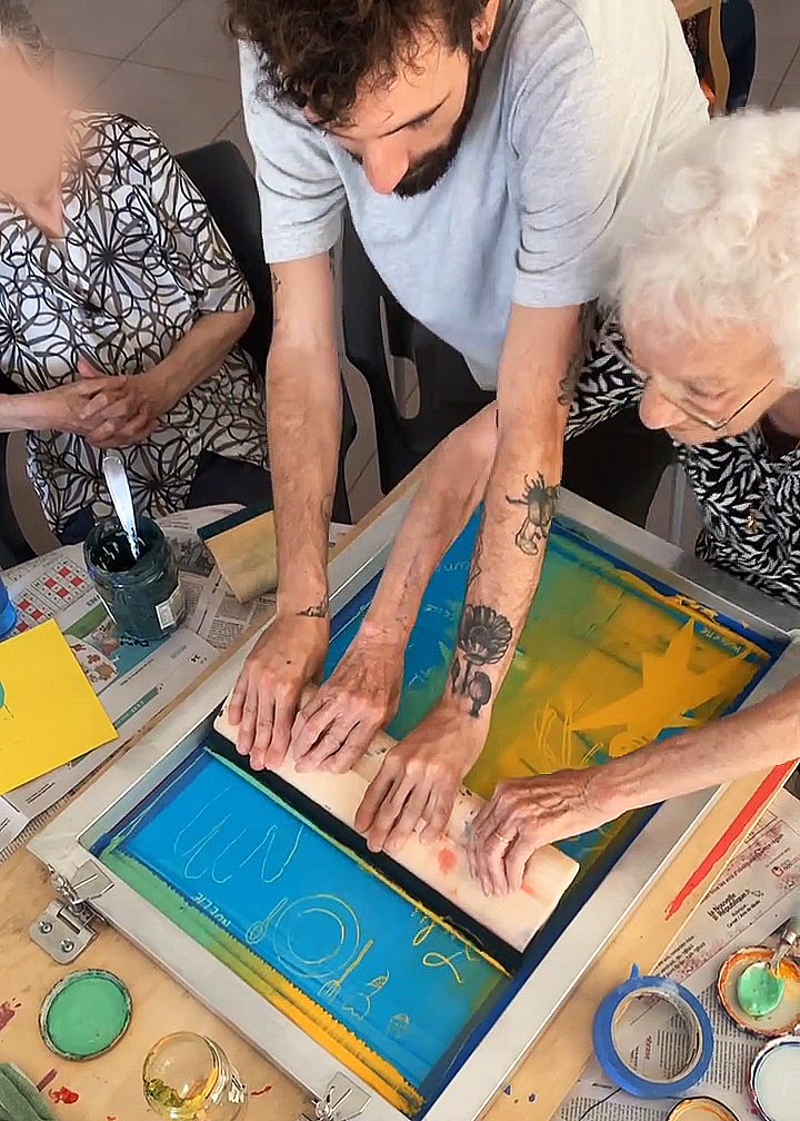 En choisissant la sérigraphie comme moyen d’expression, notre objectif était double : encourager la curiosité artistique et créer des moments d’échange et de partage intergénérationnels. Pour atteindre ces objectifs, nous avons proposé trois ateliers de trois heures dans chaque établissement. À la suite de ces neuf heures d’activité, un temps de deux heures fut dédié à la mise en commun des réalisations, offrant ainsi aux participant.e.s plus âgé.e.s et plus jeunes l’opportunité d’échanger sur leurs créations respectives.