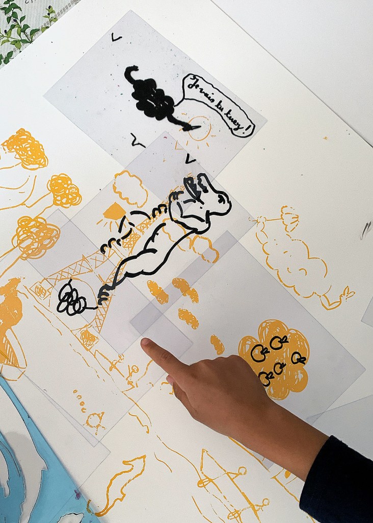 Ces ateliers se sont construits autour de la notion du souvenir. En proposant à nos publics d’évoquer un souvenir personnel, nous souhaitions les inviter à en extraire une série de formes issues de lieux, de protagonistes, d’objets, etc. Ces éléments ont donné par la suite lieu à un travail de composition à partir de médiums simple tels que le collage, le découpage ou le dessin. Ce vocabulaire de formes a ensuite été insolé sur place. Nos publics ont ainsi par la suite composé des récits imaginaires individuels et/ou collectifs à partir des formes qu’ils et elles ont fabriqués.