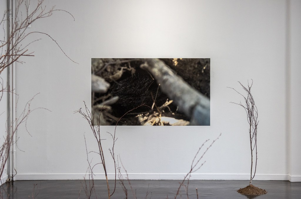 Cette photographie déplace la focale vers l’intérieur même du terrier-hutte. L’image, qui semble ouvrir une brèche dans cet espace intime, place le regard humain en position d’attente et d’observation, à l’affût de la moindre trace d’activité animale. Par ce cadrage, le spectateur devient témoin d’une rencontre différée, comme s’il guettait le retour de l’habitant des lieux. L’œuvre joue ainsi sur l’ambivalence de notre rapport au vivant : fascination pour une présence dissimulée, mais aussi conscience de notre intrusion dans un espace qui ne nous appartient pas. Le guetteur fait résonner le temps suspendu de l’attente, rappelant que toute cohabitation avec le castor implique une écoute, une patience et une attention accrues aux signes ténus de son existence.