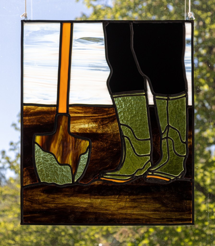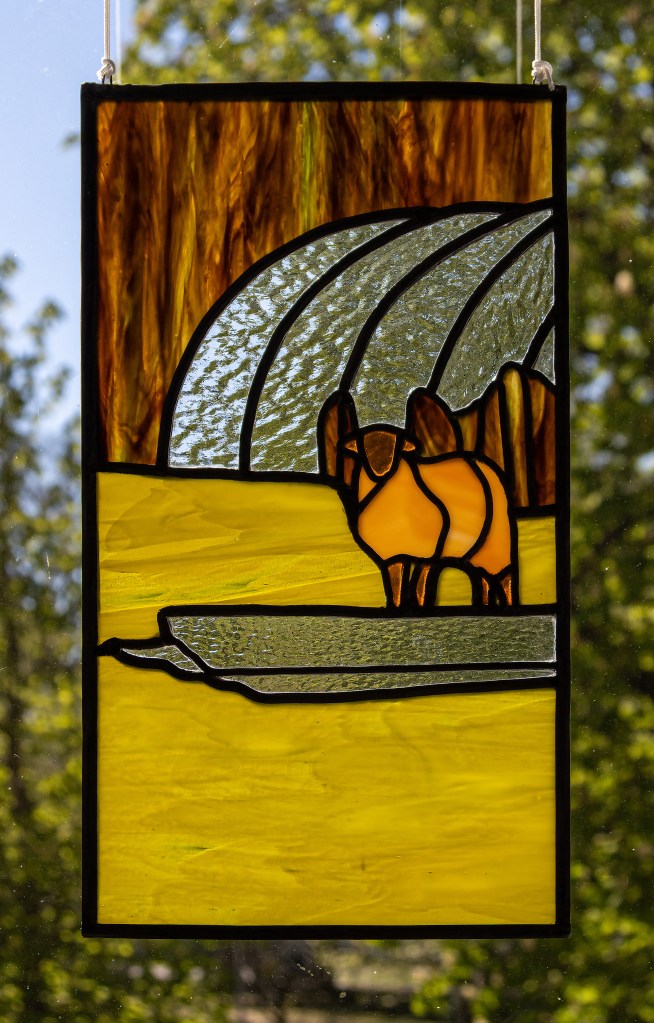 Le traitement du verre, mêlant textures et variations chromatiques, suggère une terre vibrante, tantôt nourricière, tantôt rude. Entre figuration et stylisation, ces vitraux proposent une vision sensible et symbolique du monde paysan, où gestes, outils et êtres vivants participent d’un même équilibre fragile.