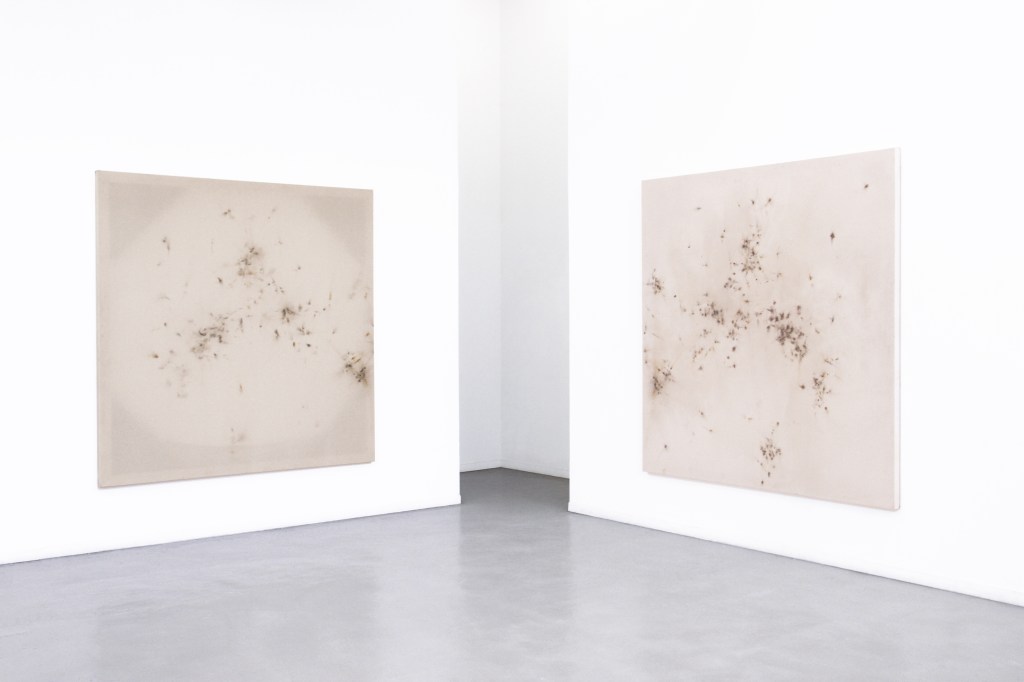 Créées selon un principe d’intimité, couchées l’une sur l’autre, comme deux corps, ces toiles subissent des explosions au sein même de leur rapport.