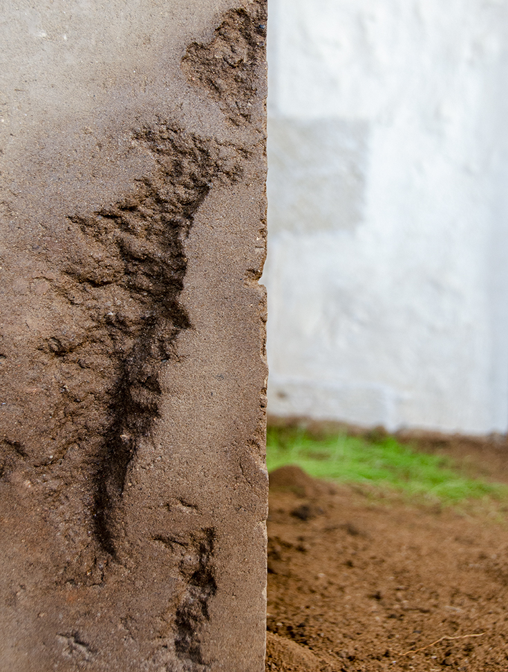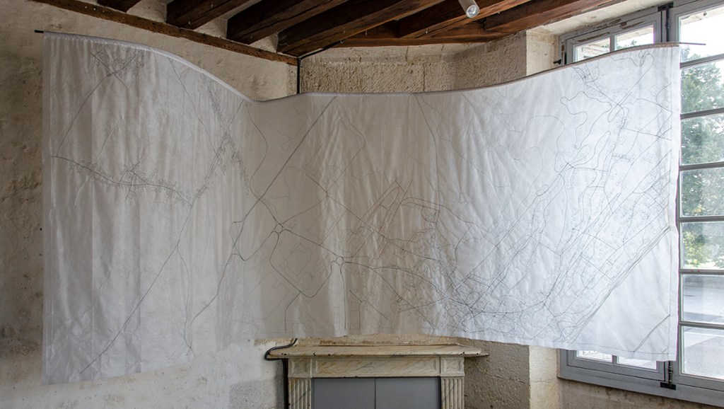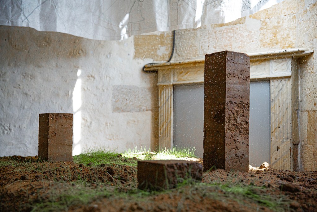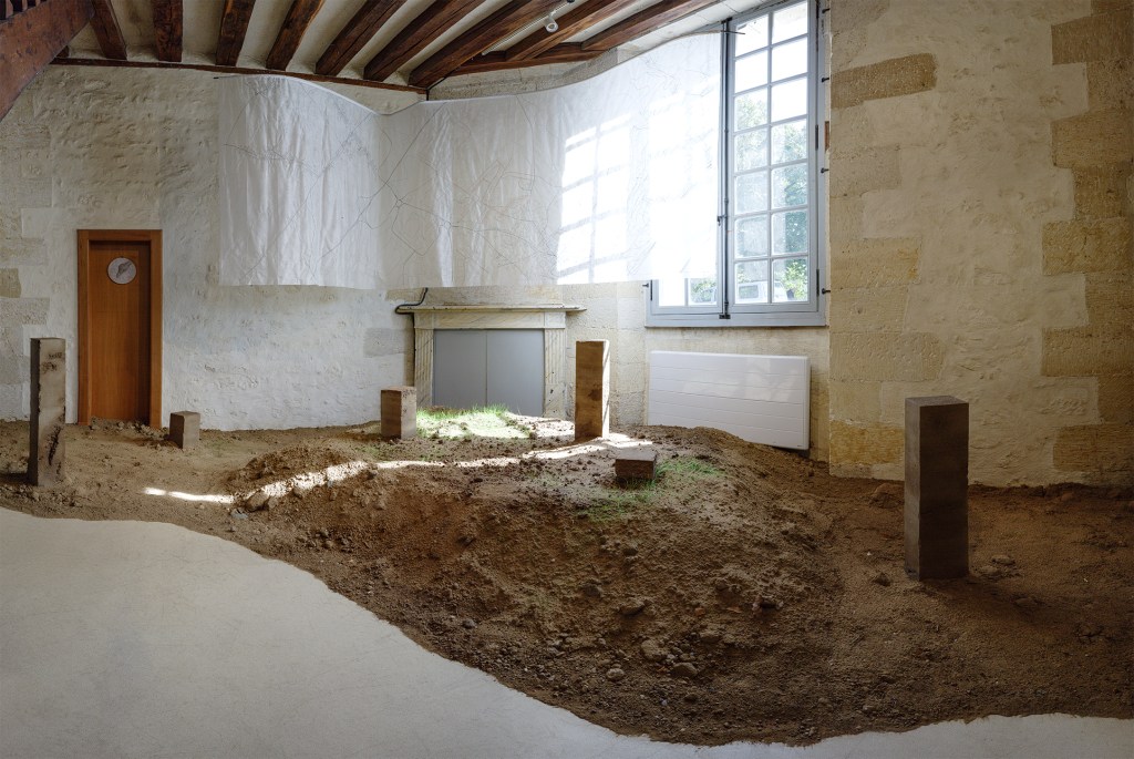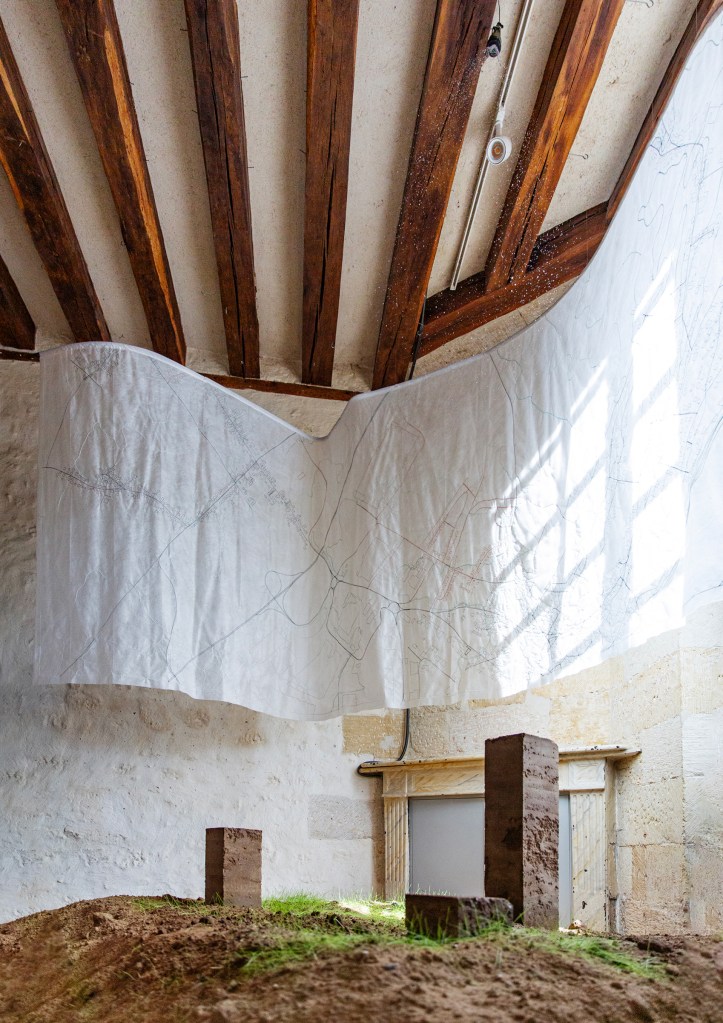 Au rez-de-chaussée, la pièce est remplie de terre provenant d’un chantier de zone pavillonaire parsemée de pelouse autour de six pisés qui se dressent. Un système disposé sous terre, comprenant une réserve d’eau puisée dans la Loire et une pompe, génère un arrosage programmé, une pluie dans le pavillon. Une grande cartographie cousue sur du voile d’hivernage est suspendue au-dessus. Elle retrace la topographie et les constructions anthropiques anciennes et nouvelles d’une partie de la commune de Meung‑sur‑Loire, ville de mon enfance.