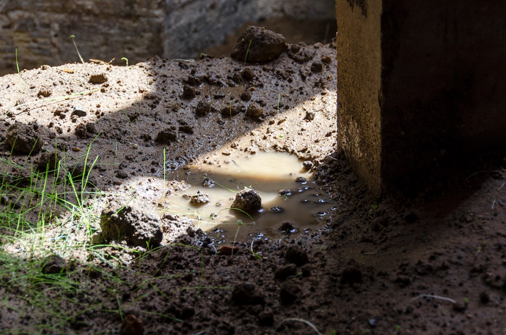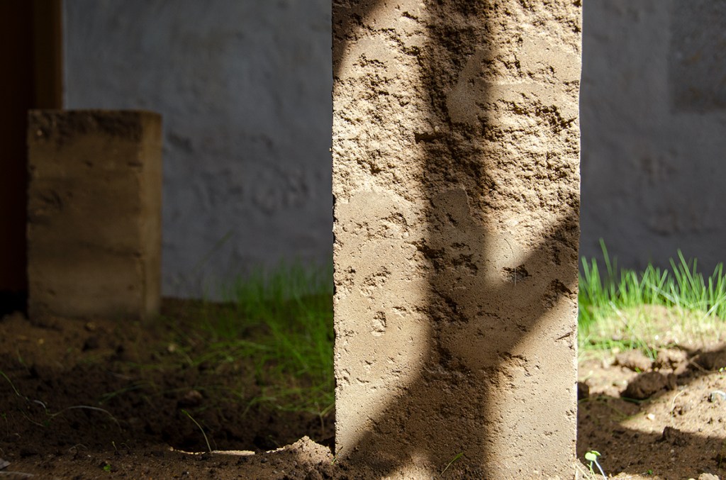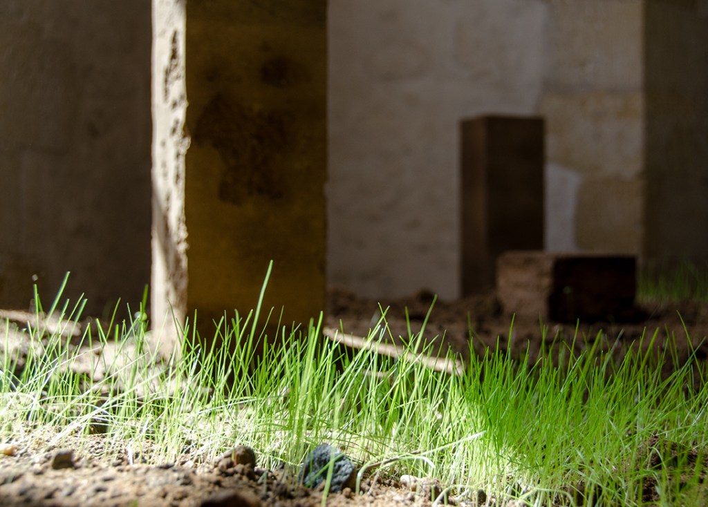 installation 1/2, terre, pisés, pelouse, eau, voile d’hivernage, fils, bois, pompe, acier,