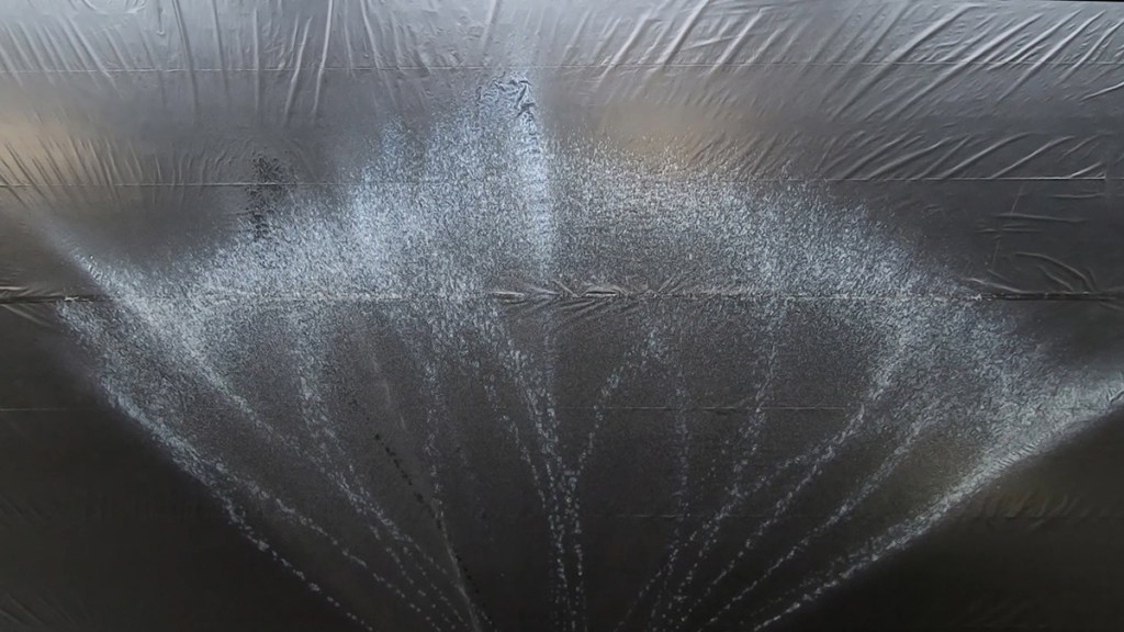 Cette pièce intervient comme une vidéo expérimentale dans le travail. Ci-dessous, nous voyons la machine, évolution de celle d’Hypnagogie, retravaillée pour faire des va‑et-vient grâce à un moteur d’essuie-glace. Ci-contre, des arrêts sur image de l’enregistrement vidéo effectué lors de sa mise en route.