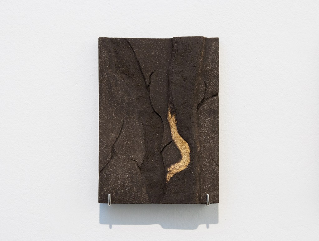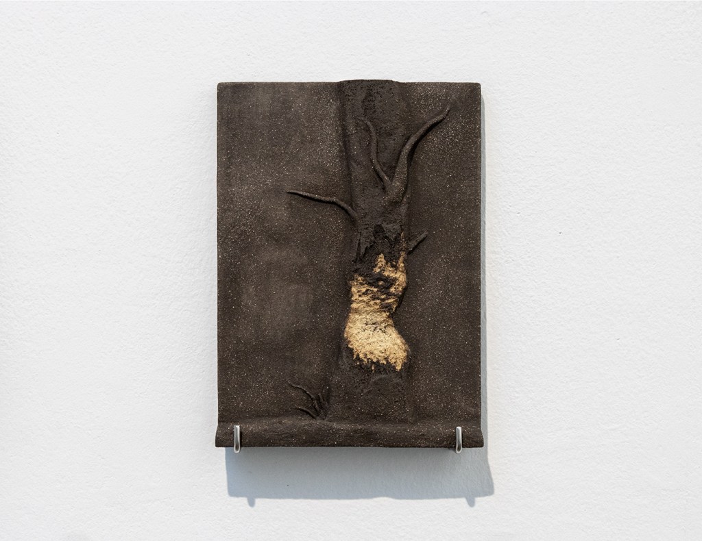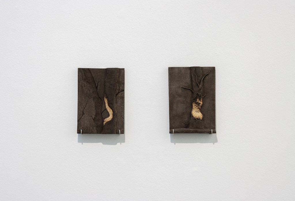 « Dans un jeu de contrastes et de textures, Josselyn David a réalisé Traces, une série de bas-reliefs en grès reconstituant des détails photographiques dans lesquels se distinguent les traces laissées par le rongeur dans le paysage. Les formes en creux dessinées par les dents du castor sur les troncs sont révélées par les différences chromatiques entre le grès noir et le grès orangé et blanc.